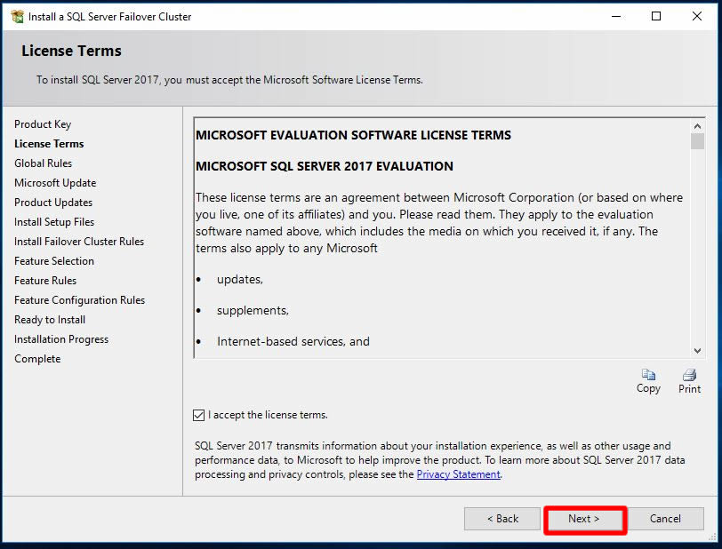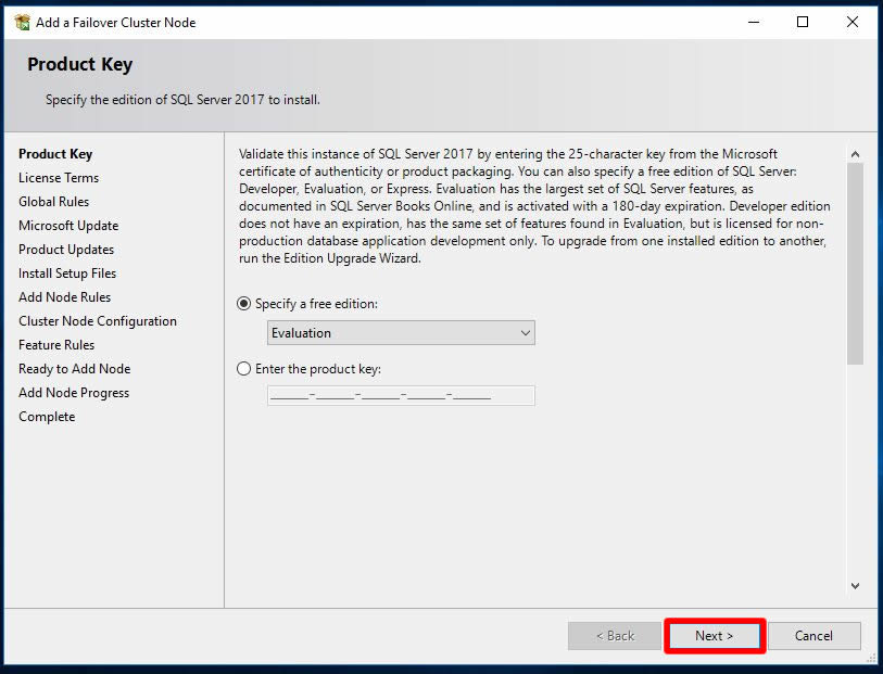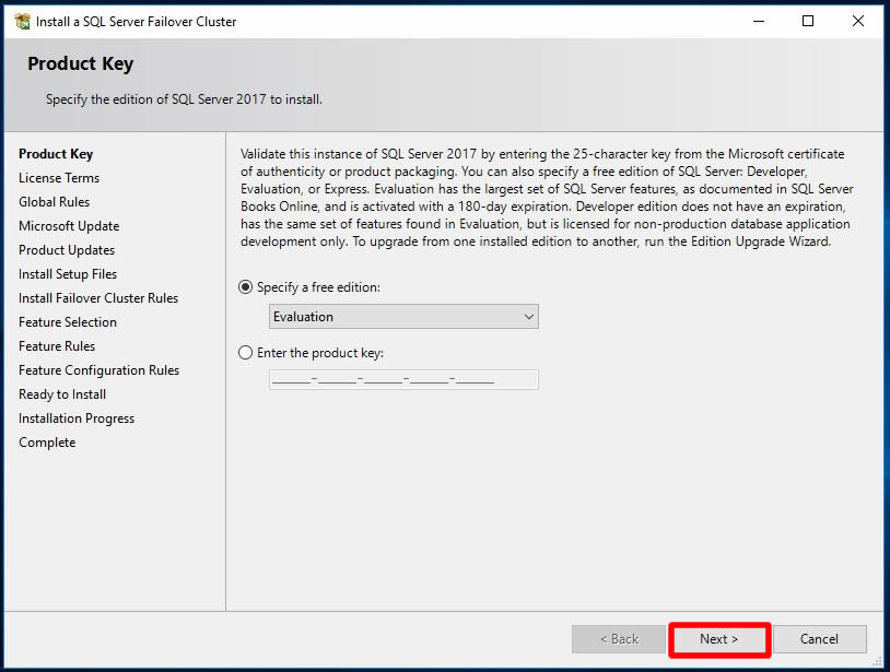 Biz yine lab ortamı olduğundan Evaluation seçimini olduğu gibi bırakarak Next ile ilerliyoruz.