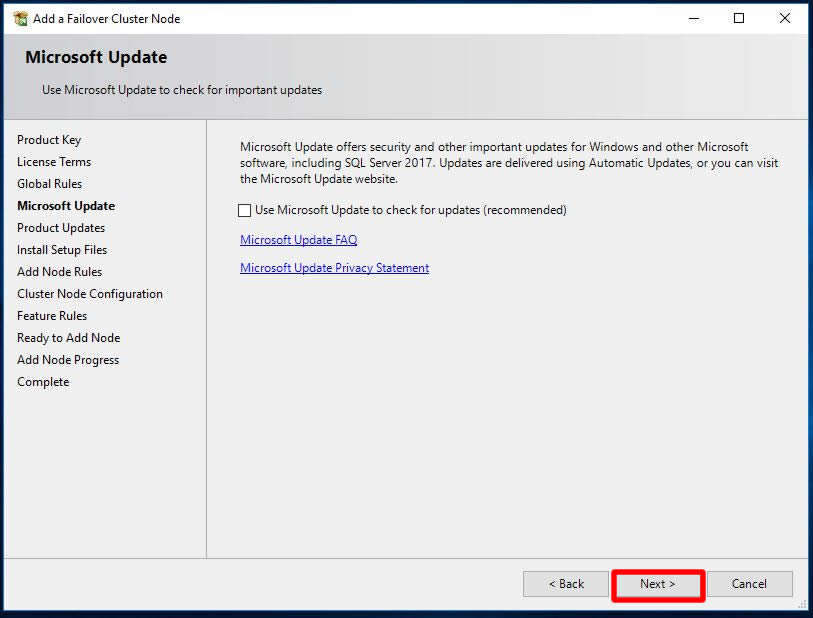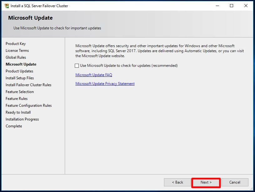 Kurulum öncesi gerekli updatelerin otomatik olarak alınmasını sağlamak için Use Microsoft Update to check for updates seçeneğini seçebiliriz. Ben test ortamında olduğum için bu adımı atlayarak Next ile ilerliyorum.