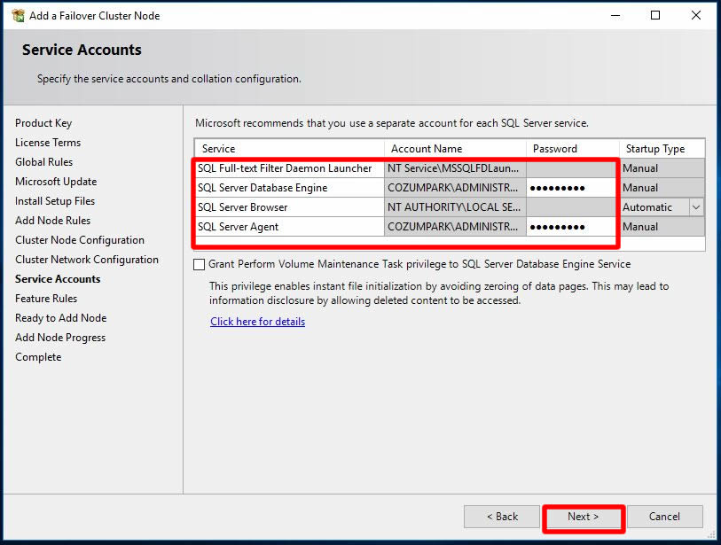 Bu ekranımızda yine node’umuz için SQL server üzerinde kullanılacak hesaplar istenmektedir. Birinci Node üzerindeki yapılandırmada kullanılan hesap bilgilerimizi bu ekrana girerek Next ile ilerliyoruz.