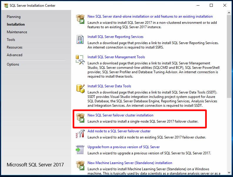 Biz Sql cluster kurulumu yapacağımız için New SQL Server Failover cluster installation linkine tıklayalım.