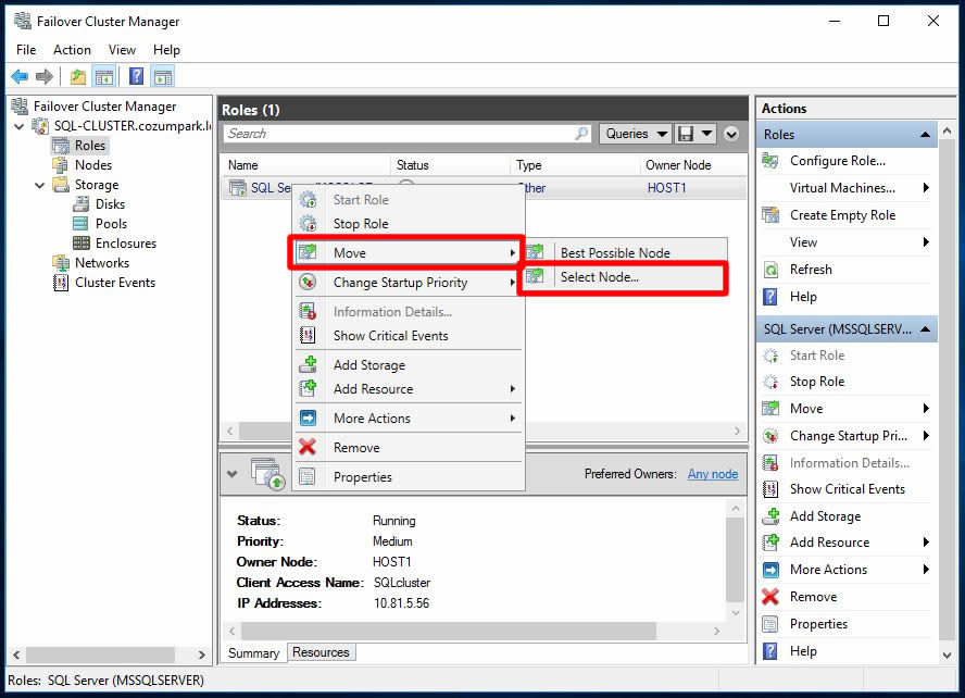 Şimdi birkaç test yapalım. Host1 isimli Node üzerinden Cluster rolümüzü Host2 isimli diğer Node üzerine taşıyalım. Rol üzerinde sağ tıklayarak Move-Select Node… açılır menüsüne tıklayalım.