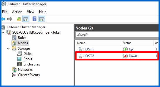 Host2 üzerinde olan rolümüzün otomatik olarak Host1 isimli diğer Node üzerine geçiyor mu kontrol edelim. Bu işlem içim Host1 isimli Node’u kapatalım.