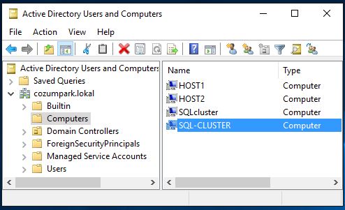 AD Computers kabında Windows Cluster kurulumunda ve Sql Cluster kurulumu sırasında belirlediğimiz isimlere göre computer öğelerinin oluştuğu görünmekte.