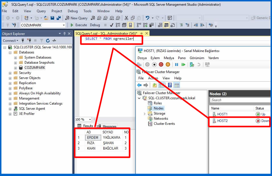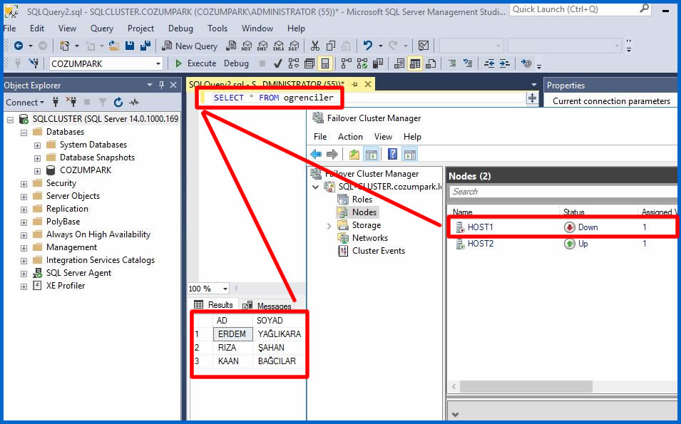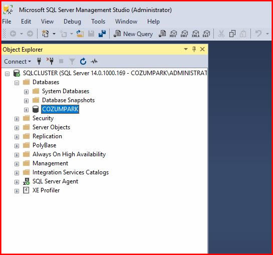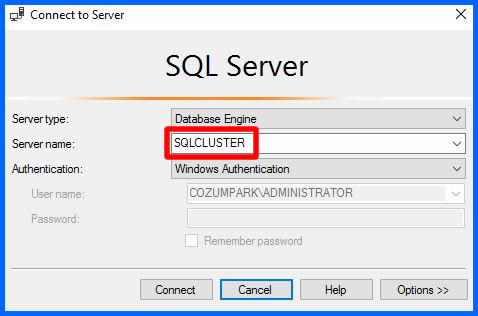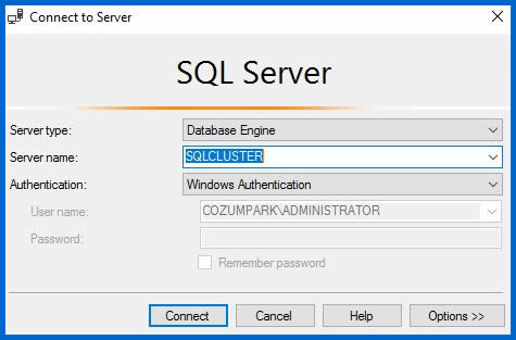 Biz SQL sunucumuza ayrı ayrı Node makinaları üzerinden erişebiliriz. Ancak Cluster ortamında amaç yedeklilik olduğundan diğer yazılımlarımızı Cluster Name bilgisine göre çalıştırmamızda yarar var. Biz Clustername ile SQL sunucumuza login olalım.