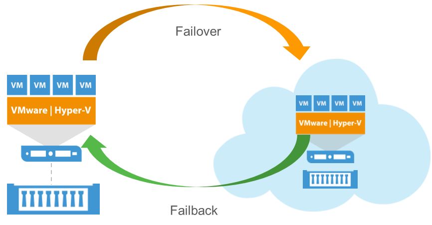 Aşağıdaki şekle göre açıklayacak olursak, Veeam üzerinde desteklenen platrom olan WMware ve Hyper-v üzerinde yer alan bir sanal makinanın, farklı bir host üzerine replikasyon yaptırılması sonucunda, Replikasyonu yapılan sunucu üzerinde bir sorun olması durumunda, fail olan sanal sunucunun hizmetinde kesinti yaşanmaması adına sistemin replikasyon yapılan host üzerindeki sunucu üzerinden çalıştırılmasıdır.