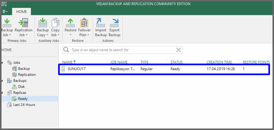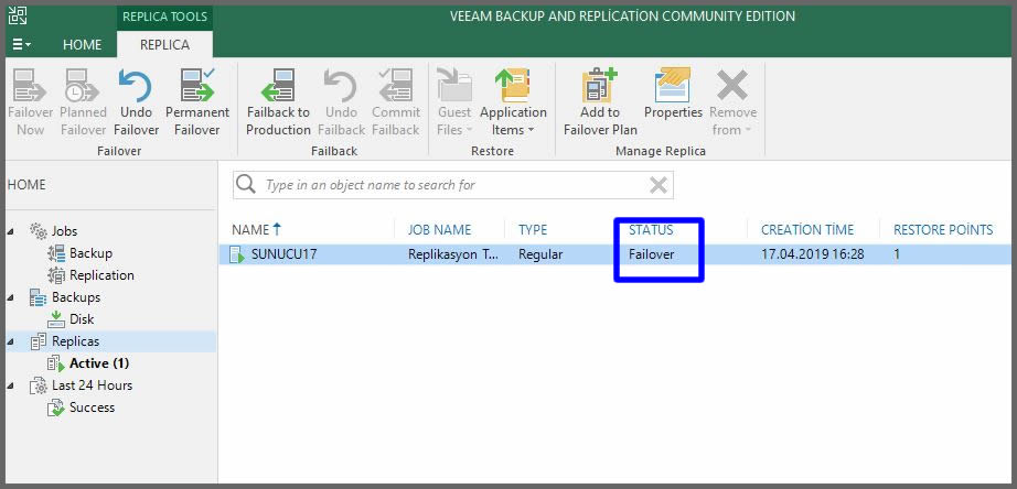 Makale başındaki resimde durumu Replication ve Ready olan sanal makinamızın durumu Failover olarak değişti.