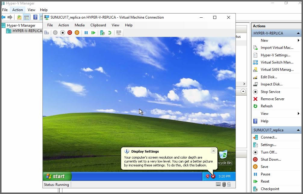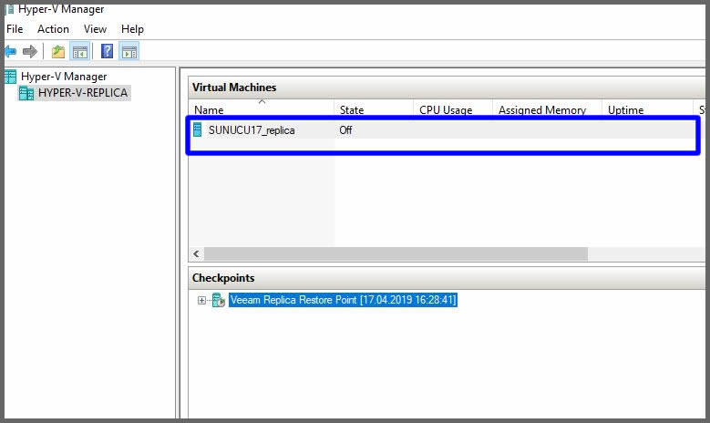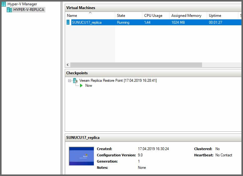 Bizim test ortamımızda hali hazırda, Hyper-v platformu üzerinde bulunan ve farklı bir host üzerine replikasyon yaptırılmış bir sunucumuz var.