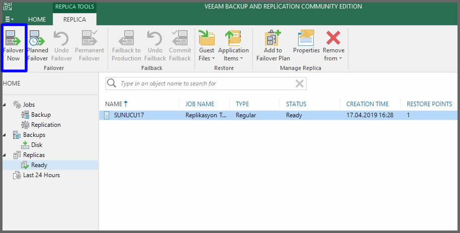 Bu durumda replika alan sunucu üzerindeki sanal makinamızı, alınmış olan replikaların uygun bir zaman diliminde çalıştırarak sistemin sorunsuz işlemesini sağlayabiliriz. Bu işlem için replikasyon yapılan makine üzerine tıkladığımızda üst kısımda gözüken menülerden Failover Now butonuna tıklayalım.