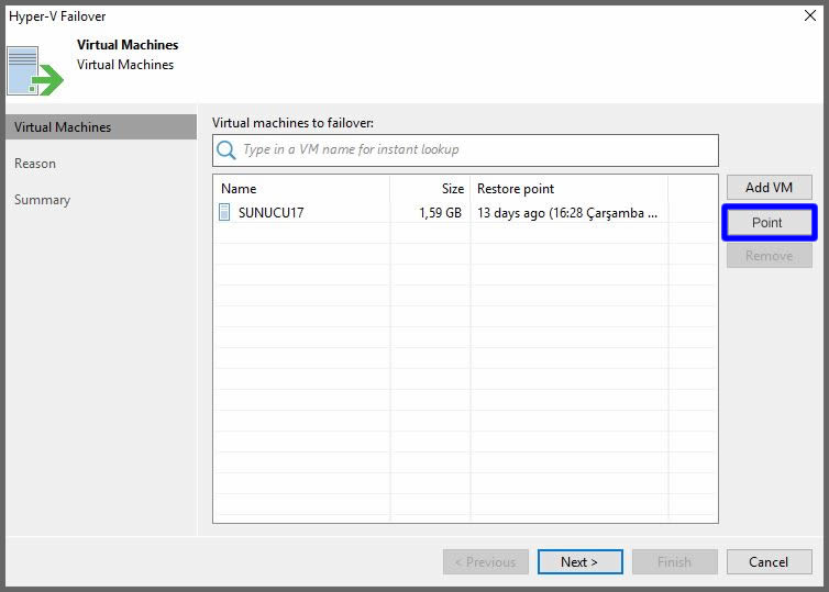 Açılan ekranımızda, Add VM seçeneği ile yapacağımız işleme başka makinalar ekleyebilir, Point butonu ile sanal makinanın farklı zamanlarda alınan replikasyon yedeklerini görebiliriz. Point butonuna tıklayalım.