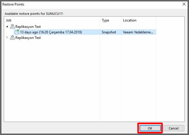 Bizim sanal makinamız 2 kez replikasyon işlemine tabi tutulmuş. En son replikasyon ile yolumuza devam edeceğimiz için, en son replikasyon zaman noktasını seçerek OK butonu ile sonraki adımımıza ilerleyelim.