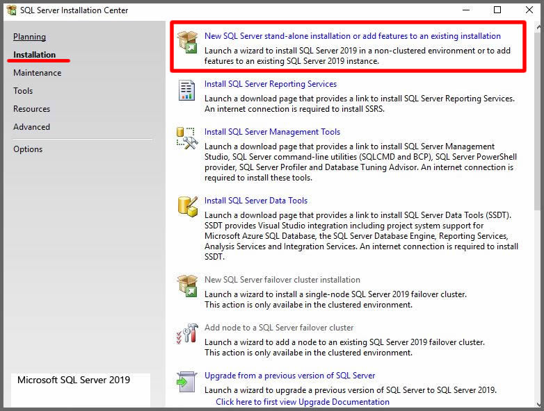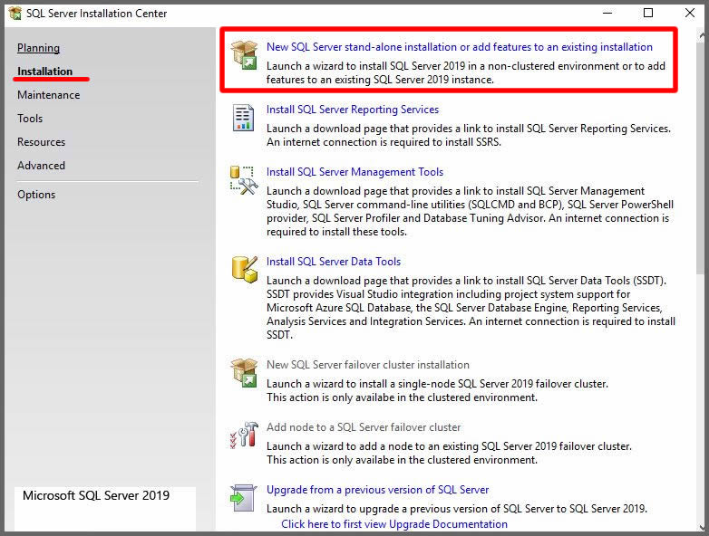 Sql-Server1 isimli sunucumuz üzerinde SQL Server 2019 kurulumumuzu başlatalım. Biz SQL Always On mimarisi yapılandıracak olduğumuz için New SQL Server stand-alone installation or add features to an existing installation seçimini tıklayalım.