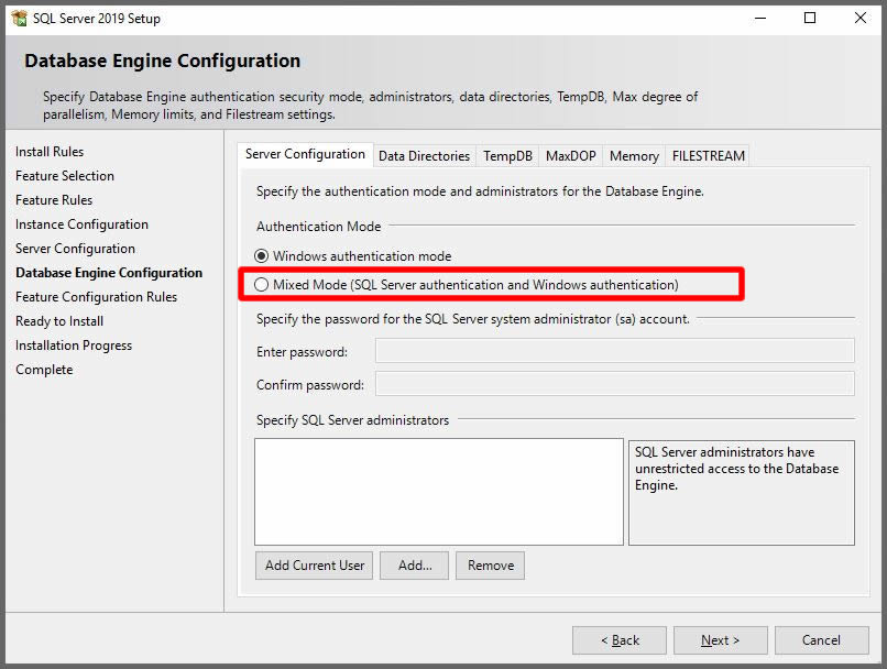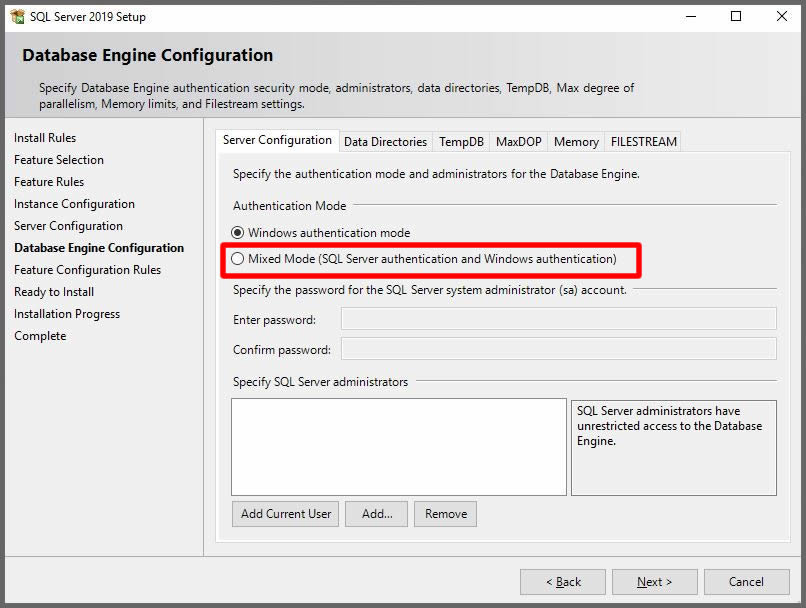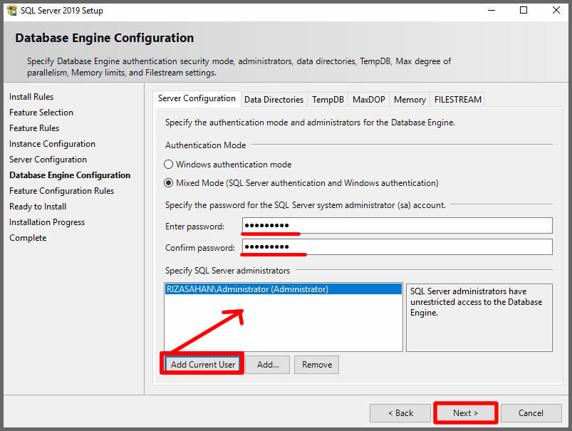 Database Engine Configuration kısmında kimlik doğrulama metodunu seçmemiz ve bunun için kullanıcı belirlememiz istenmektedir. Sql Server Windows kimlik doğrulaması ve Sql Server kimlik doğrulaması ile kurulabilmektedir. Biz ikisinin aynı anda aktif olma durumunu isteyebiliriz. Bu nedenle “Mixed Mode” çimini işaretliyoruz. Add Current User butonuna tıklayarak mevcut kullanıcımızı Windows Authentication için ekleme işlemini yapalım.
