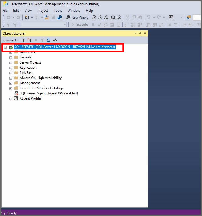 Sunucumuz yeniden başladı ve SQL Management Studio üzerinden SQL sunucumuza bağlantı sağladık.