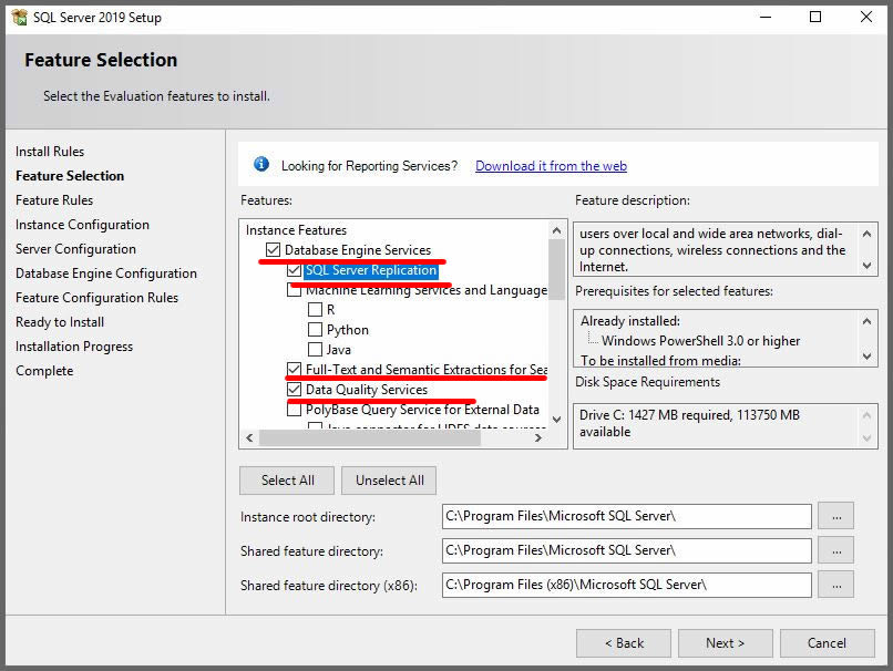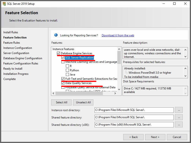 Kurulum için gerekli bileşenleri seçiyorum. Bir kurulum yaparken tüm bileşenleri yüklemek son derece yanlış bir adım. Bu nedenle bize gerekli olan SQL bileşenlerini yükleyeceğiz. Bu nedenle Database Engine Services, SQL Server Replication, Full-Text and Semantic Extractions for Search ve Data Quality Services bileşenlerini seçiyorum. Kurulum yapılacak olan path bilgilerine dokunmadan Next ile sonraki adıma ilerliyorum.
