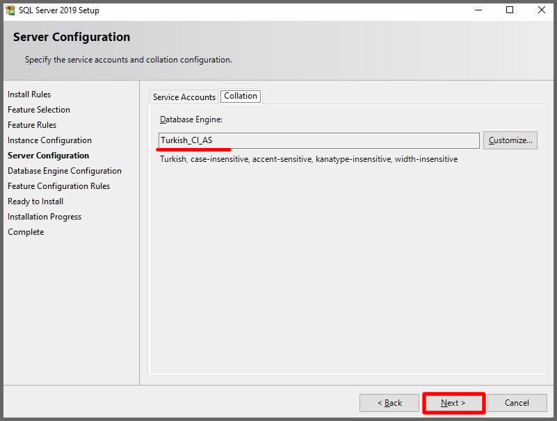 Collation tabında özel bir dil seçiminiz olmayacak ise default olarak bırakabilirsiniz. Genelde SQL Latin CP1_CI_AS kullanılır ancak ben Turkish_CI_AS seçimine dokunmadan Next ile sonraki adıma ilerliyorum.