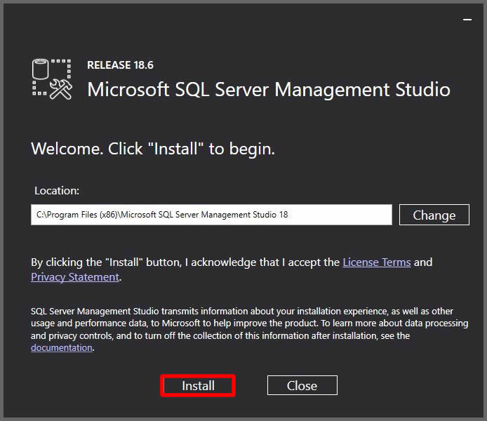 SQL Server yönetimi için artık ayrıca kurulması gereken ve SQL Server kurulumundan bağımsız olarak kurulan SQL Management Studio kurulumunu yapalım. https://aka.ms/ssmsfullsetup bu adresten kurulum dosyalarını indirdikten sonra setup dosyasını çalıştırıp açılan ekranda Install butonuna tıklayalım.