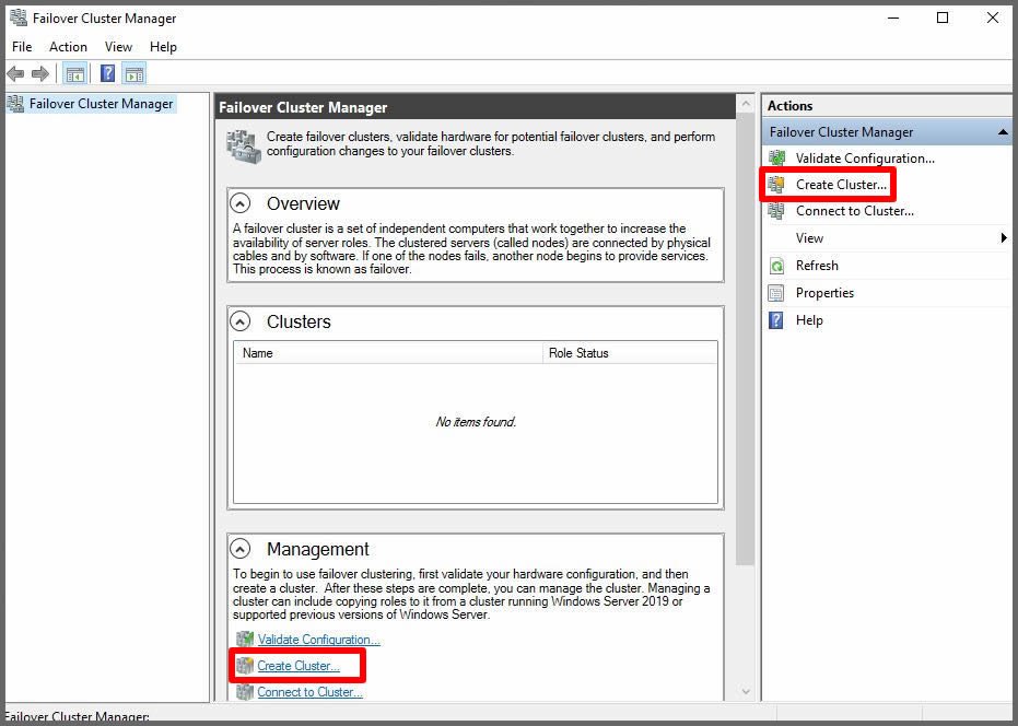Sunucularımızdan bir tanesi üzerinde Failover Cluster Manager konsolunu açalım. Konsol üzerinde Create Cluster… linkine tıklayalım.