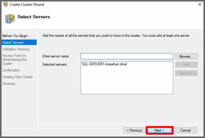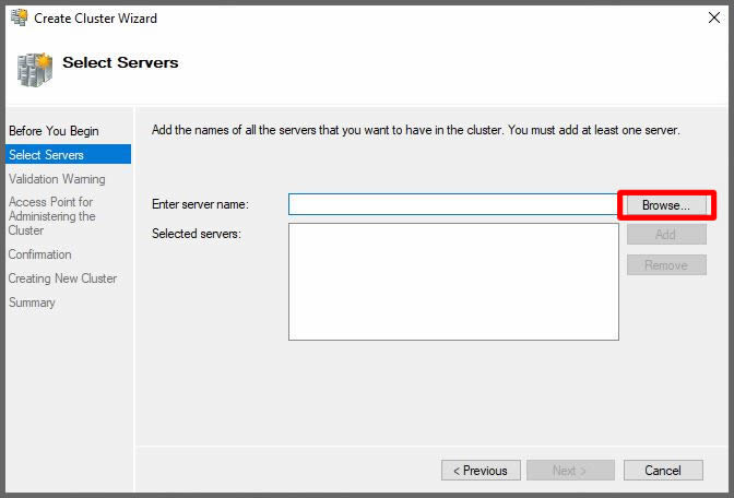 Cluster’a dahil olacak sunucuları belirlemek için Browse… butonuna tıklayalım.
