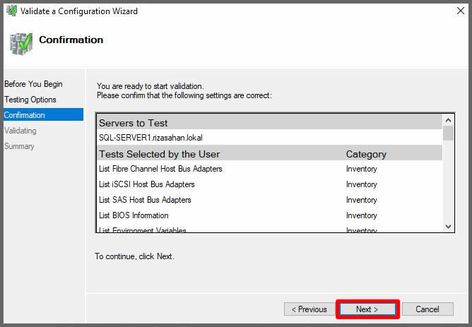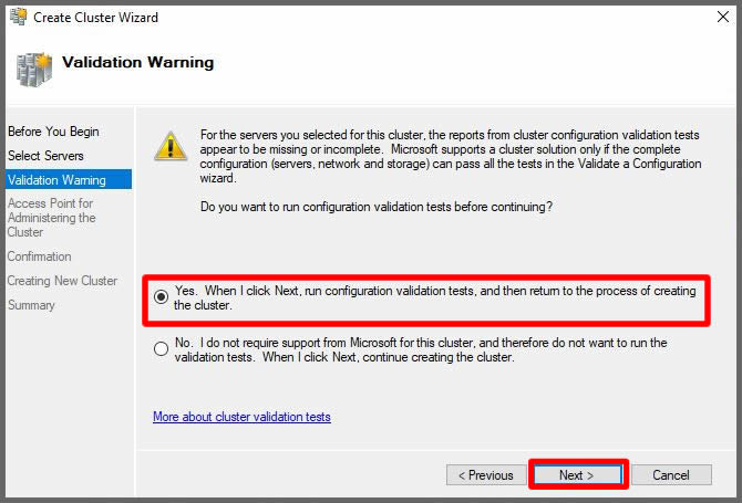 Cluster kurulumu öncesinde bizden bir test yapmamız gerektiği noktasında bilgi veriliyor. Biz test yaparak bir olumsuzluk olup olmadığını gözlemleyebiliriz. Bu nedenle “Yes. When I click Next, run configuration validation tests, and then return to the process of creating the cluster.” Seçimini yaparak Next ile sonraki adıma ilerliyoruz.