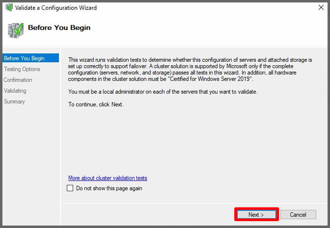 Test işlemi öncesinde sihirbaz bize donanım ve yazılımlar noktasında Windows Server 2019 uyumlu ürünleri seçmemiz gerektiği noktasında bilgiler veriyor. Next ile sonraki adıma ilerleyelim.