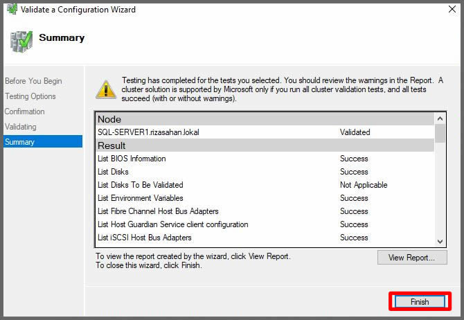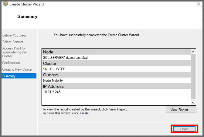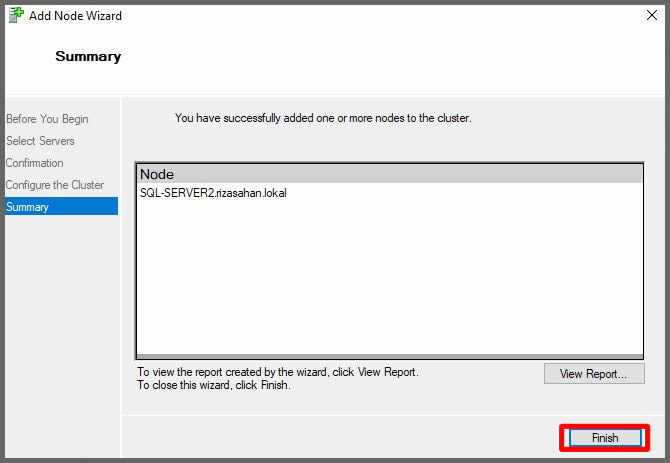 SQL-Server2 isimli sunucumuz cluster içerisine dahil edildi. Finish ile bu adımımızı da tamamlayabiliriz.