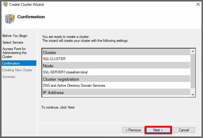Finish butonuna tıklamamızla birlikte Cluster yapılandırma ekranı tekrardan karşımıza geldi. Öncelikle cluster için bir isim belirlememiz gerekmekte. Ben SQL-CLUSTER ismini veriyorum. Sonrasında Cluster için bir ip adresi belirlememiz gerekmekte. Ben sunucu ip bloğundan 10.81.2.245 ip adresini cluster ip adresi olarak belirleyip Next ile sonraki adıma ilerliyorum.