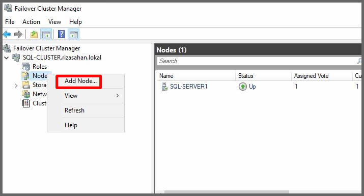 Şimdi diğer sunucumuz üzerinde yani SQL-Server2 isimli sunucu üzerinde Failover Cluster Manager Konsolunu açarak ikinci sunucumuz olan SQL-Server2 isimli SQL Sunucumuzu cluster içerisine ekleyelim. Bu işlem için Nodes üzerinde sağ tıklayarak açılan menüden Add Node… linkine tıklayalım.