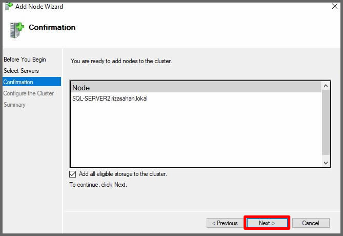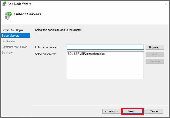 Cluster’a dahil edilecek olan sunucumuzu Browse… butonu ile gösterip veya Enter server name alanına ismini girerek Add butonuna tıklayalım. Selected servers alanına SQL-Server2 isimli sunucumuz eklendi. Next ile sonraki adıma geçebiliriz.