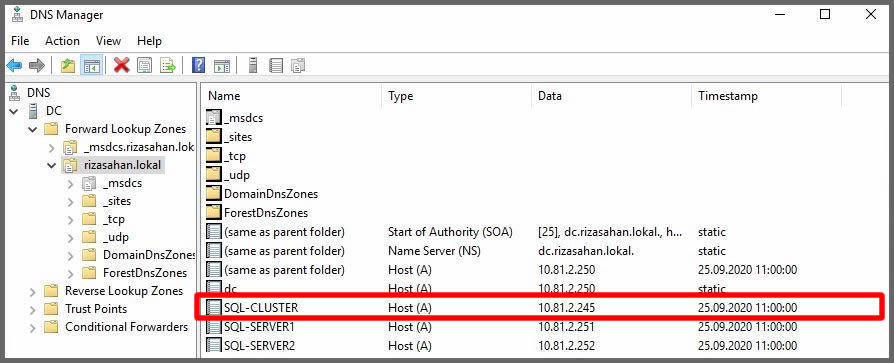 Dns üzerinde Cluster oluşturma sırasında SQL-CLUSTER objesi için DNS kaydı otomatik olarak oluşmuş durumda.