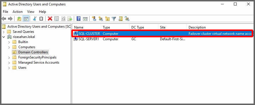 Active Directory üzerinde yine Cluster için SQL-CLUSTER computer objesi oluşmuş durumda.