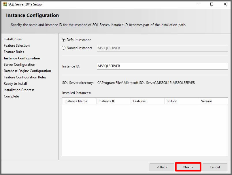 Bu ekranımızda kurulacak olan SQL için bir instance ismi belirleyebilir veya varsayılan instance ismi ile kurulum adımını geçebiliriz. Biz burada ayar değiştirmeden varsayılan olarak “MSSQLSERVER” instance ismini değiştirmeden “Next” ile sonraki adıma ilerliyoruz.