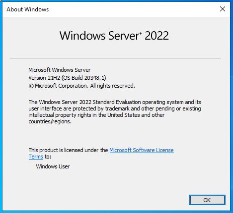 Versiyon olarak Server 2022 ve Build numarası aşağıdaki gibi gözükmekte.