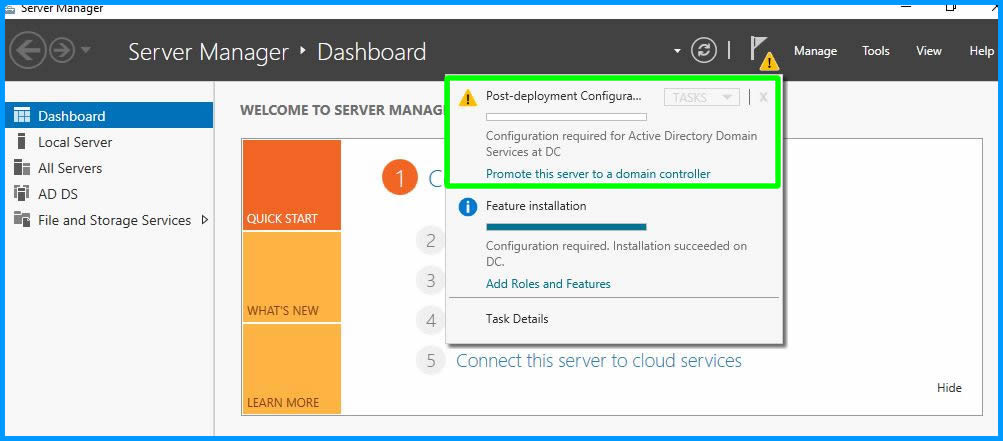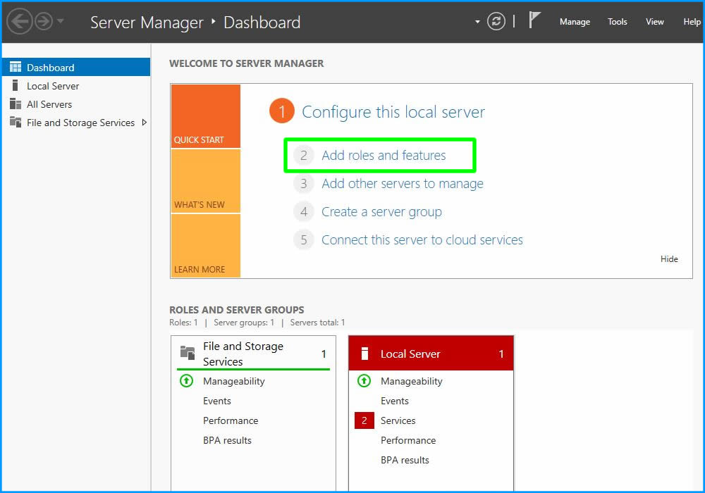 Şimdi AD rolümüzü kurmak için Server Manager konsolu üzerinde Add roles and features linkine tıklayalım.