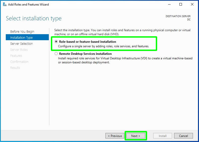 Bu nedenle biz RDS kurulum ve yapılandırması yapmayacağımız için Role-based or feature-based insallation seçimini yaparak Next ile ilerliyoruz.