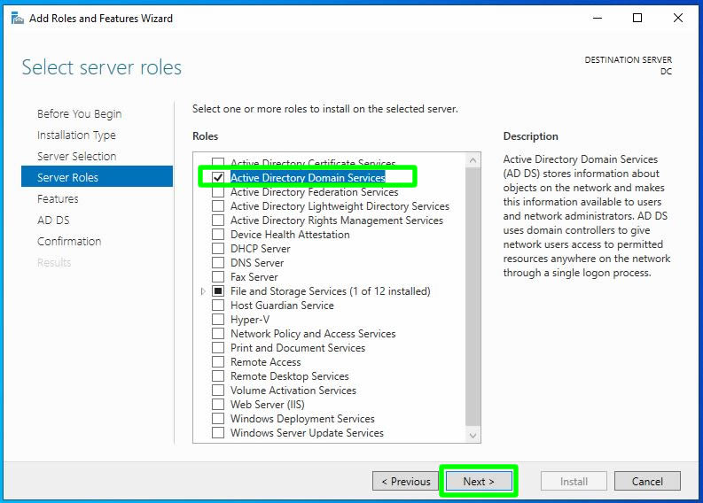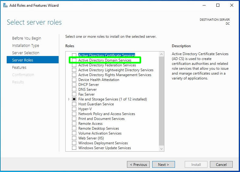 Karşımıza gelen ekrandan kuracak olduğumuz Active Directory Services rolünü seçiyoruz.