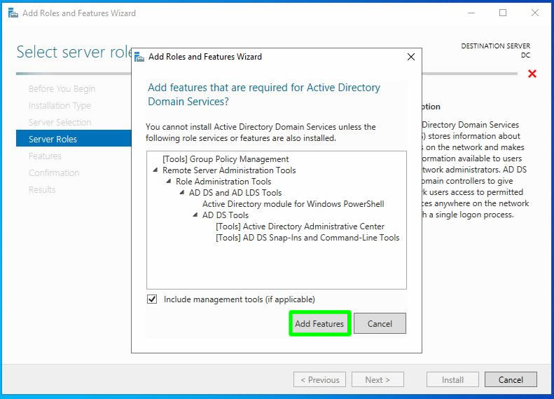 Active Directory rolünü kurmak istediğimizde bu rolün kurulabilmesi için farklı özelliklerin ve bileşenlerin gerekli olduğunu gösteren bir ekran karşımızda belirliyor. Rol kurulumu için gerekli olan bu bileşenlerinde yüklenmesi için Add Features butonuna tıklayalım.