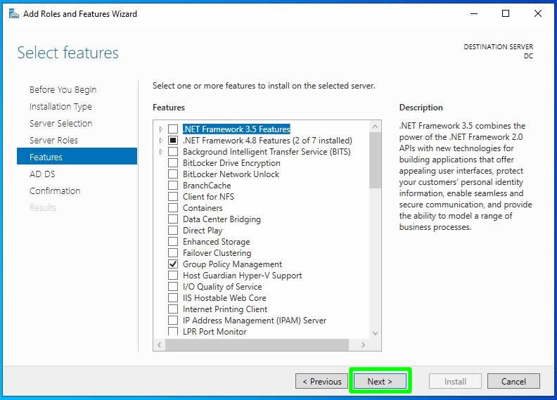 Bir sonraki ekranımızda özellik ekleme ekranımız bizi karşılamakta. Bir özellik ekleme istediğimiz durumda bu ekranı kullanmalıyız. Biz bu ekranda bir özellik eklemeyeceğimiz için Next ilerleyebiliriz. Burada dikkat edecek olursanız bir önceki ekranda gerekli olan özelliklerin kurulmasına onay vermiştik. Bu ekranımızda gerekli olan .Net ve Group Policy Management özelliklerinin seçilmiş olduğunu görüyoruz.