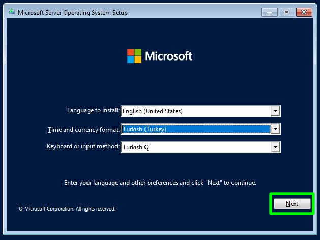 Gerekli dil, bölgesel ayar ve klavye bilgisini seçtikten sonra Next ile ilerleyelim.