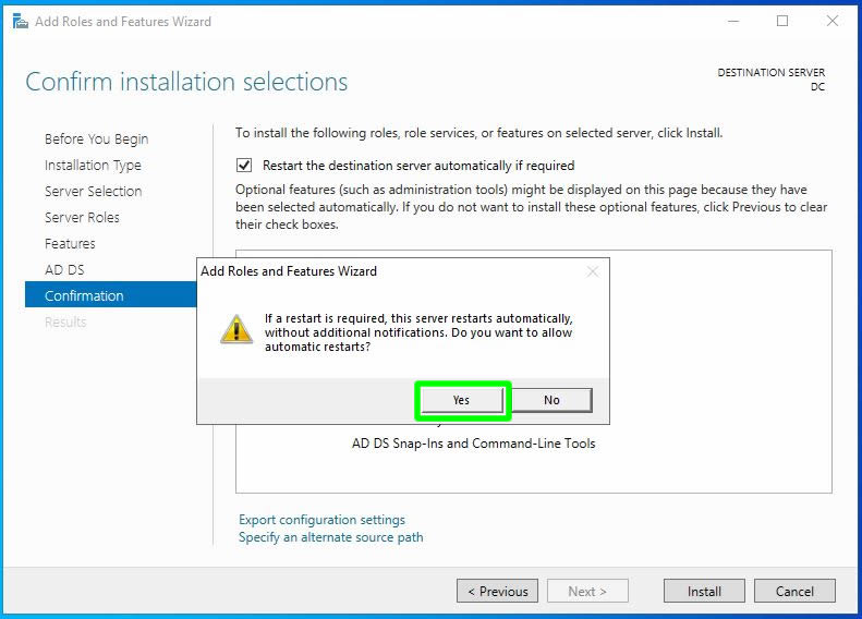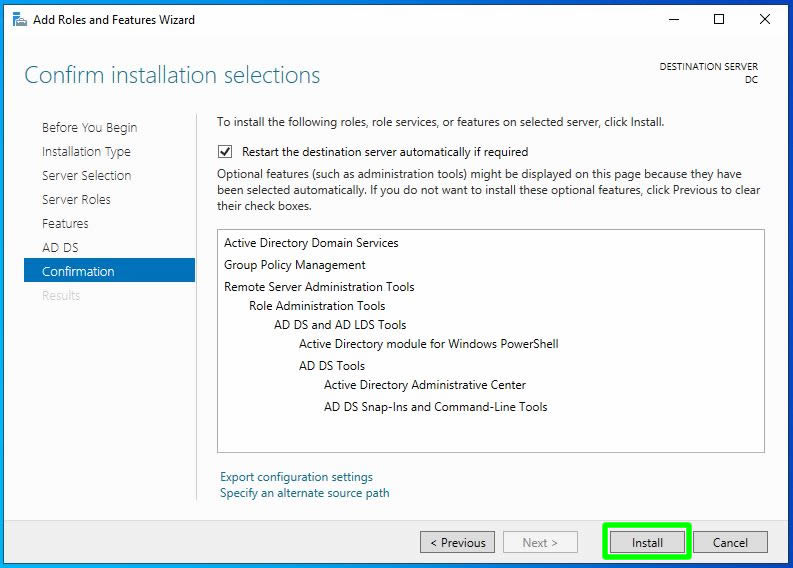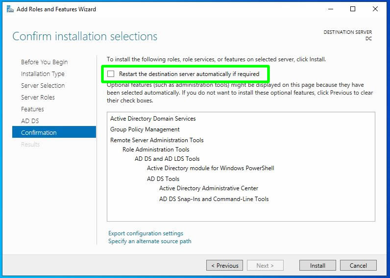 Kurulum sırasında yeniden başlama gereksinimi olmasına durumuna karşın “Restart the destination server automatically if required” seçimini yapalım.
