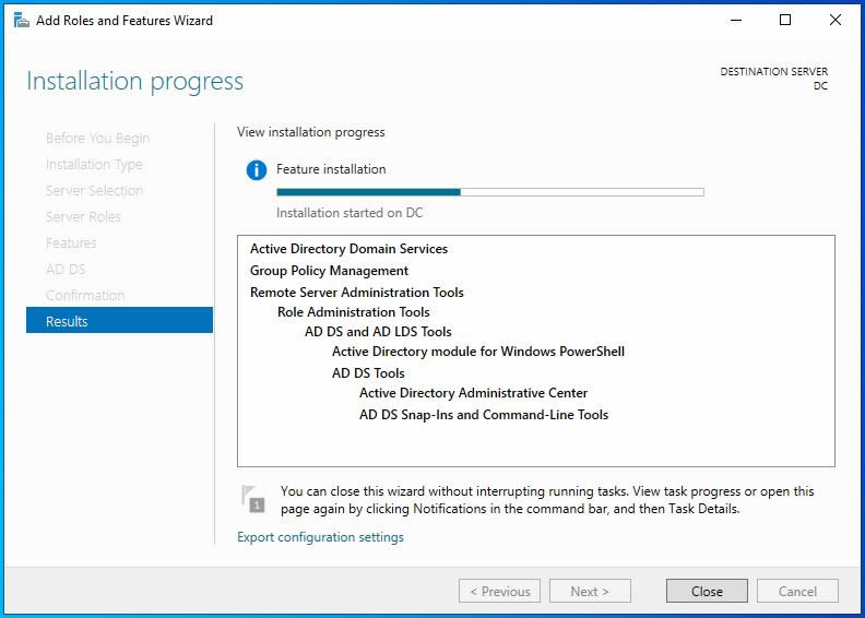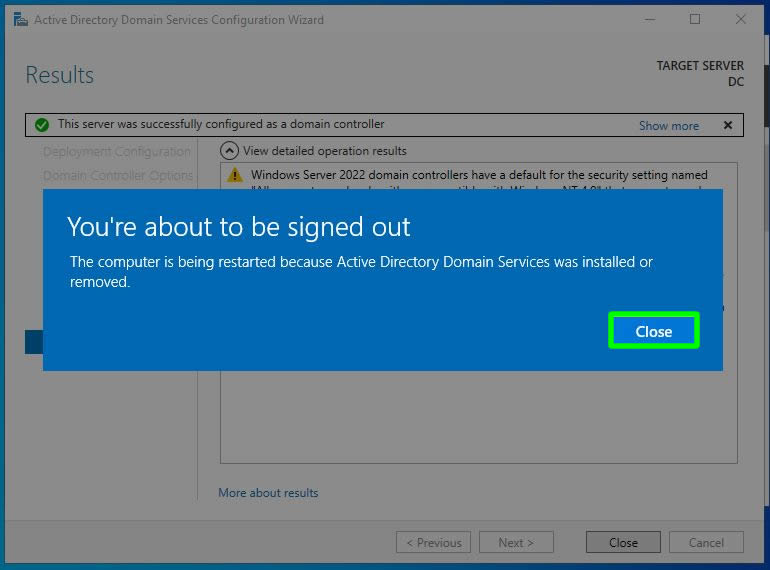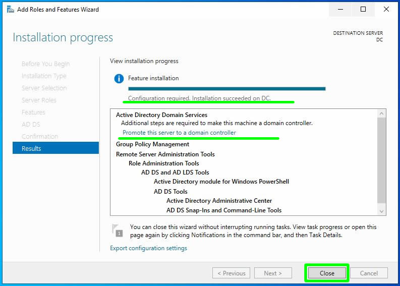 Ön kurulum işlemi tamamlandı. Promote this server to a domain controller seçimi ile yapılandırma işlemini başlatabiliriz. Biz Close ile ekranı kapatalım işlemimize server manager konsolu üzerinden devam edelim.