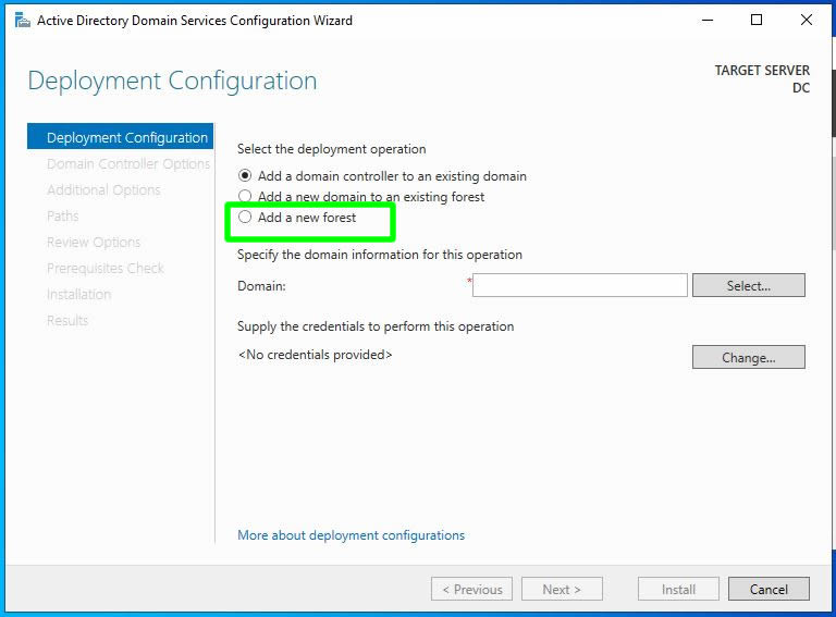 Mimarimizi biçimlendirme adımının ilkine geldik. Bizim ortamımızda bir Forest bulunmadığı, Mevcutta olan bir domaine ve foreste dahil olmayacağımız yani, ortamımızda ilk foresti kurup bu forest üzerinde ilk domaini yapılandıracağımız için Add new forest raido butonu ile seçimimizi yapmalıyız.