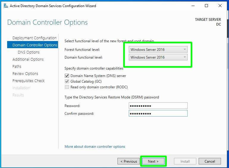 Bu ekranımızda kurulacak olan Domain yapımız için forest ve domain seviyelerini belirlememiz gerekmektedir. Bu seviye Server İşletim sisteminin yapabileceklerinin kapasitesini belirler diyebiliriz. Örnek olarak Active Directory Recycle bin özelliği için Forest Functional Level seviyesinin en az Windows Server 2008 olması gerekmektedir. Günümüz itibari ile en sonra forest ve domain functional level seviyesi Windows Server 2016 seviyesine gelmiştir. Detay için http://sozluk.cozumpark.com/goster.aspx?id=1629&kelime=Domain-ve-Forest-Function-Level buradan yararlanabilirsiniz. Domain Controller üzerinde DNS ve Global Catalog olmazsa olduğu için bu seçimleri yapmamız gerekmektedir. Biz Read only domain controller kurmadığımızdan bu seçimi yapmadan varsayılanda olduğu gibi bırakıyoruz. Read only domain controller konusunda http://sozluk.cozumpark.com/goster.aspx?id=798&kelime=RODC-Read-Only-Domain-Controller buradan yararlanabilirsiniz.
