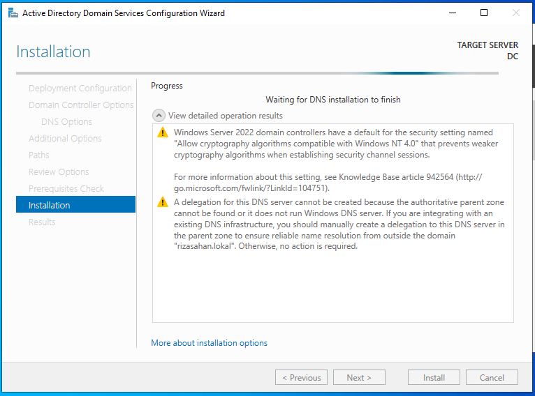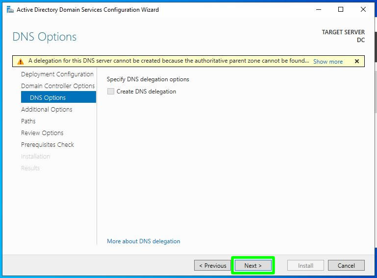 Bu ekranımızda DNS sunucumuz kurulu olmadığından bir uyarı almaktayız. Biz Domain Controller kurulumu sırasında DNS rolünün de kurulup gerekli ayarların otomatik olarak yapılacak olmasından Next ile bir sonraki adıma ilerliyoruz.