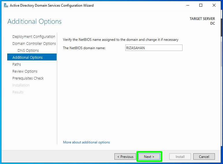 Domain adımıza göre oluşan netbios name otomatik olarak gelmekte burada yine Next ile sonraki ekrana ilerliyoruz.