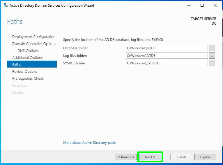 Active Directory ve Log database yolları karşımıza çıkıyor. Biz burada default ayarları bırakarak bir sonraki adıma Next ile ilerliyoruz.