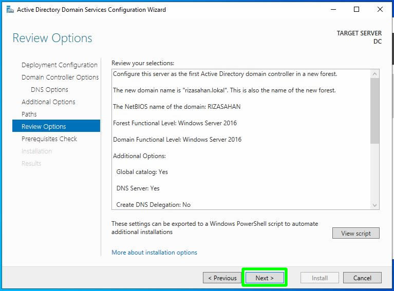 Bunun sonrasında ise kurulacak olan root domain için bir isim belirlemeliyiz. Ben test ortamında olduğum için rizasahan.lokal ismini veriyor ve bir sonraki ekrana Next ile ilerliyorum.