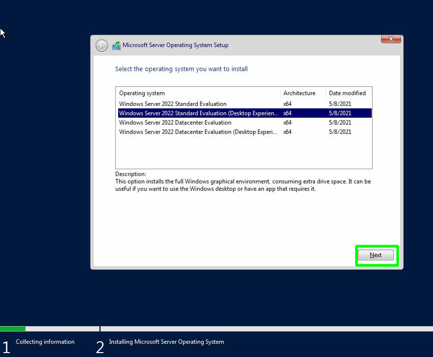 Bu ekranda kurulum yapılacak olan versiyonu seçebilirsiniz. Standart ve Datacenter sürümlerinin grafik ve komut aya yüzlü olanlarını seçme şansımız var. Biz grafik ara yüz yani klasik kurulum yapacağımız için Windows Server Standart (Desktop Experience) seçini iler sonraki adıma Next butonuna tıklayarak ilerliyoruz.