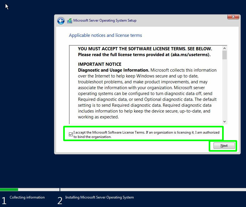 Sözleşmeyi kabul ederek Next ile sonraki adıma ilerliyoruz.