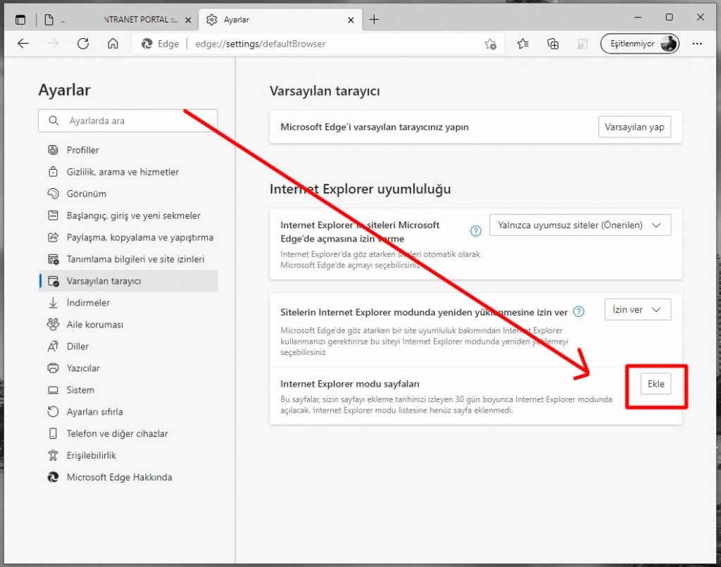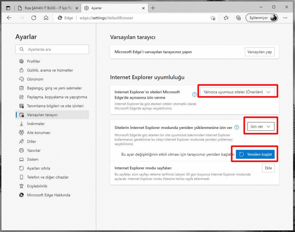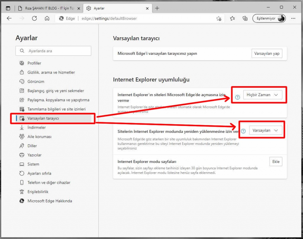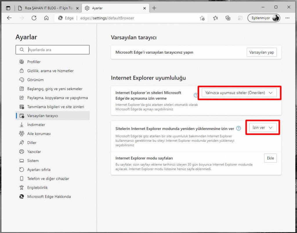 Açılan ekranda Varsayılan Tarayıcı menüsüne tıklayalım. Şu anda Internet Explorer’ın siteleri Microsoft Edge’de açmasına izin verme ve Sitelerin Internet Explorer modunda yeniden yüklenmesine izin ver seçenekleri aşağıdaki gibi.