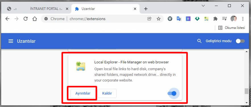 Yine uzantılar burada yardımımıza yetişiyor. Ben Lokal Explorer – File Manager on Web Browser uzantısını uzun uğraşlar sonucunda araştırarak buldum ve yarama tabiri caiz ise merhem oldu. Bu uzantıyı kurup aktive ettikten sonra Ayrıntılar kısmına girelim.